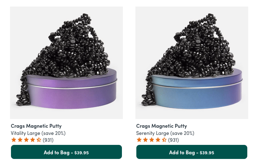 When I click on Shop All, I get to a Crags landing page (finally!), but frustratingly, I immediately notice that none of the finish categories I just saw on the dropdown menu are part of the product listings. Instead, I get labels that blend color names and sizes, like Harmony Small! Dandy Medium! Vitality Large!