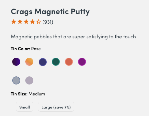 I could not figure out how to get the pebble color and size combo that I wanted, because none of the labels matched how I expected product color and sizing to work. And while it’s the sloppy information architecture of it all that calls out to me, it’s really a failure of product design. The way this company conceptualizes their products is disorganized, and that disorganization bleeds through into how the products are categorized, labeled, and displayed on the site. What we, as users, get is: