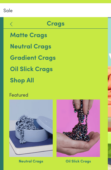 From this Shop menu, a few products have additional side menus to show off variants — like Crags, which are tiny pebble magnets (obviously, of course, how could you not know that). Their side menu reveals options for Matte Crags, Neutral Crags, Gradient Crags, Oil Slick Crags, and a Shop All link, as well as visual cards for Neutral Crags and Oil Slick Crags: